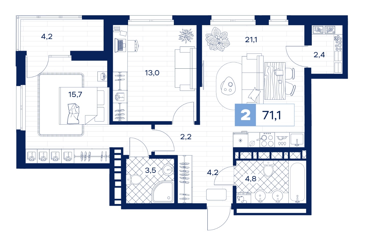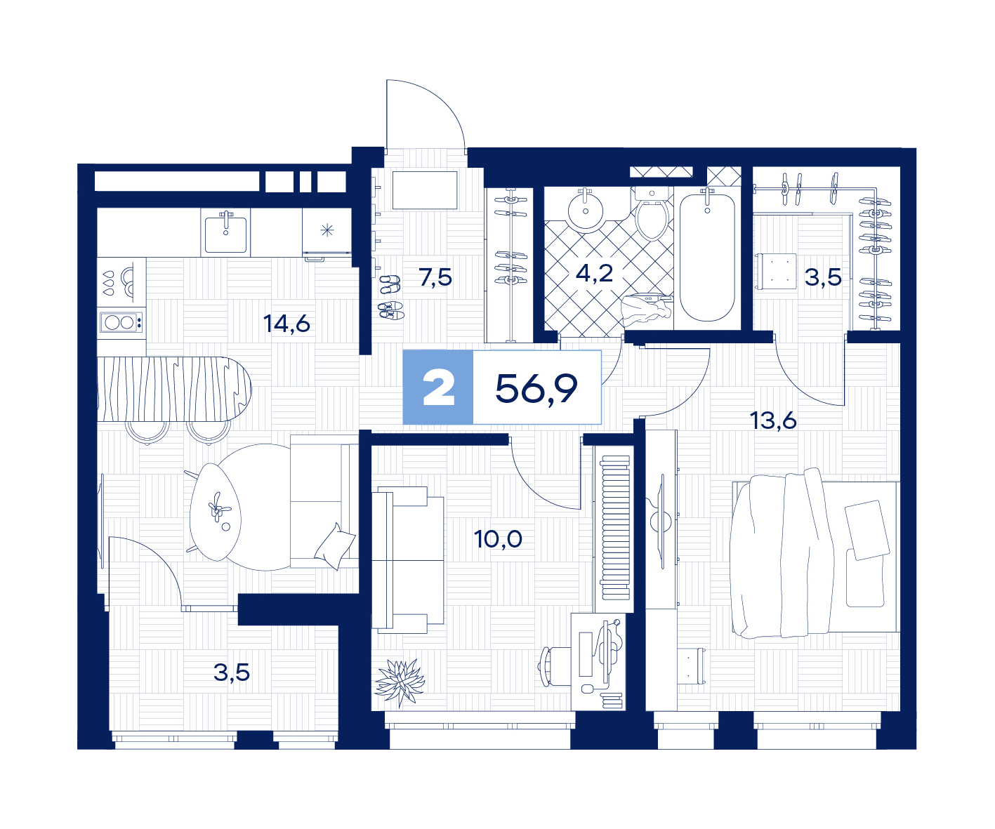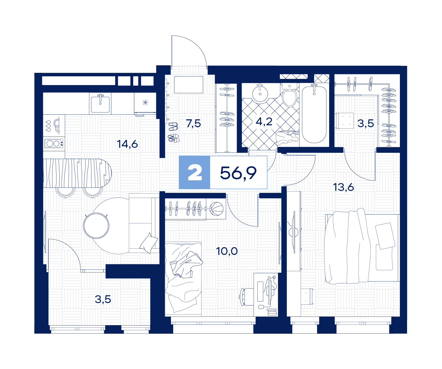 Пример — двухкомнатная квартира с кухней-столовой 21 м², которая является частично проходной. Из нее можно попасть в приватную зону квартиры и в бакалейную. Дом Нойферта, г. Тюмень, РФ